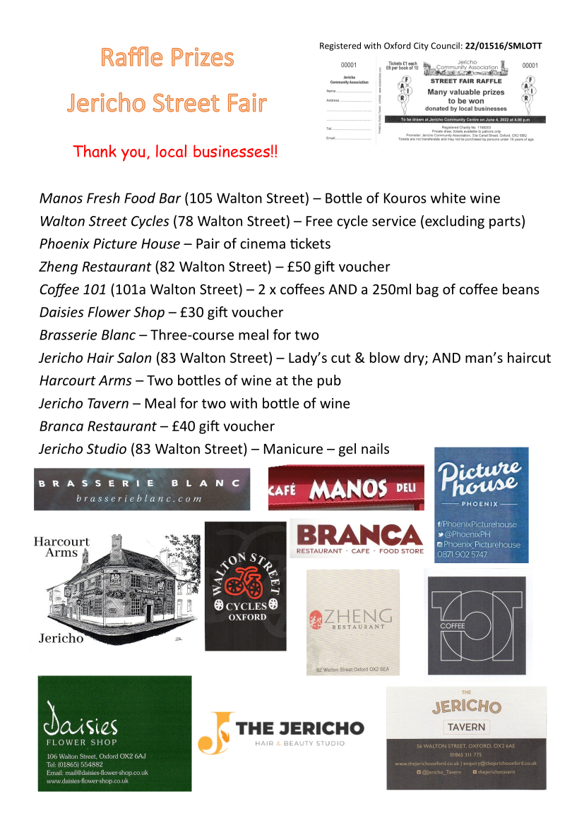 Jubilee@jericho starts with the Jericho Street Fair on June 4 which this year includes a street party tables area for you to celebrate with your own food or that bought at the fair. Lots of fun and food for children and everyone else and a huge variety of stalls. if you would like to book a stall, please click here. Great music at the Old Bookbinders stage and on into the evening. Local busineses are also being very generous with raffle prizes (see below).
